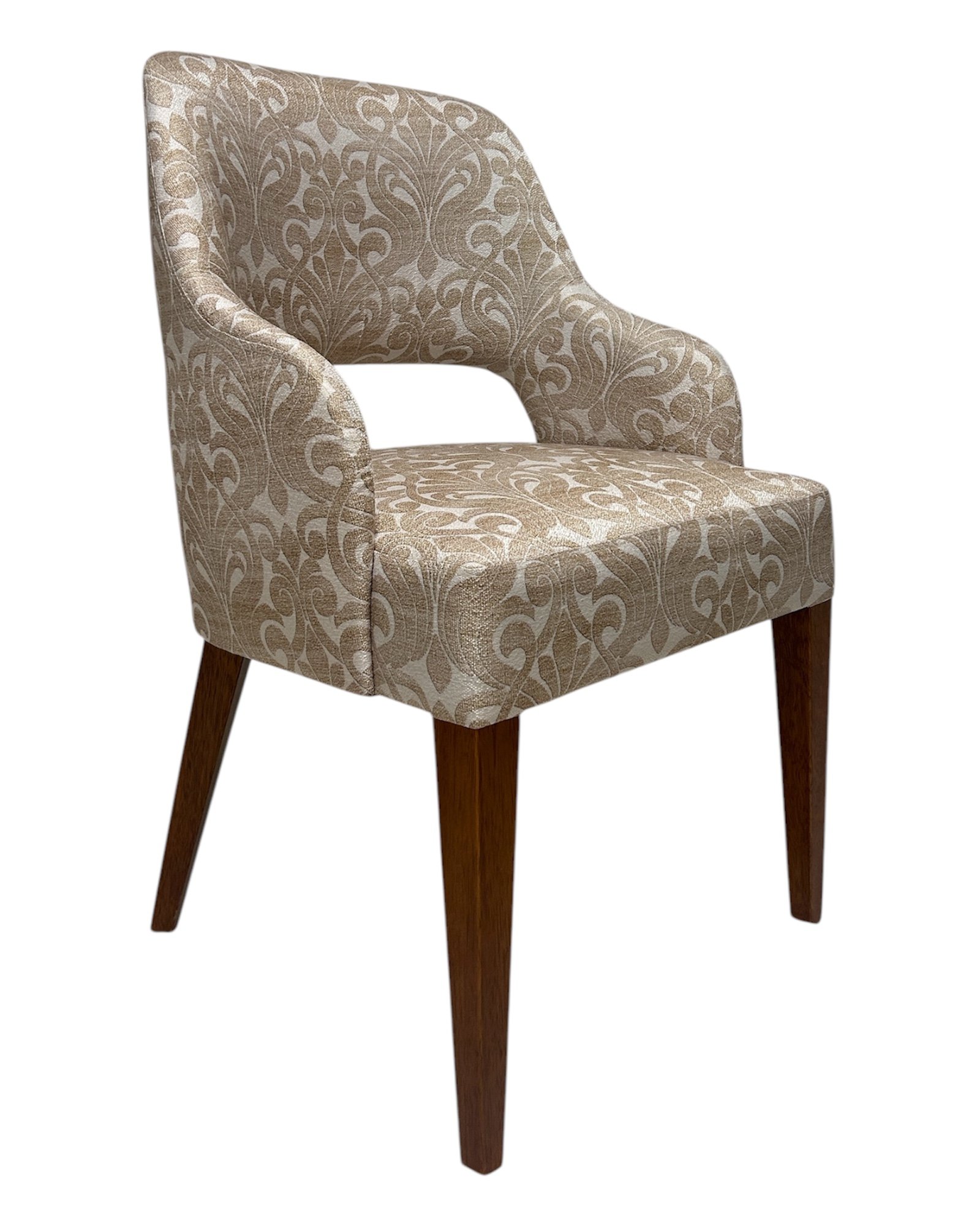 Butaca curva con un hueco al medio, patas de madera de 35cm de alto. Espuma zebra y napa siliconada. Tapiz antifluidos.